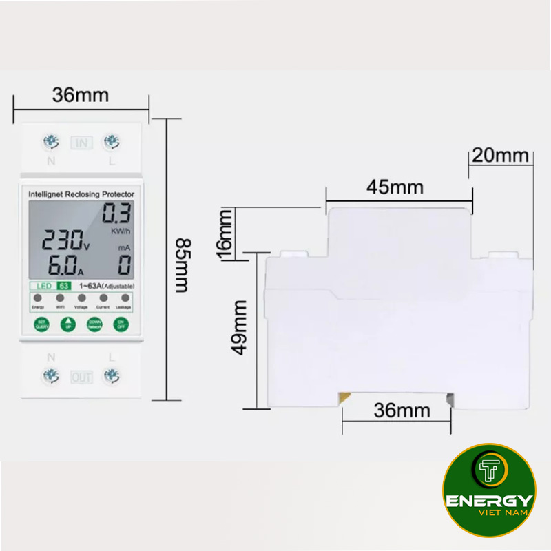 – Màn hình hiển thị 4 thông số : Kw, Ampe, Volt, Dòng Rò – Ampe, Volt, Dòng Rò có thể cài đặt thay đổi thông số dễ dàng qua ứng dụng App Tuya.